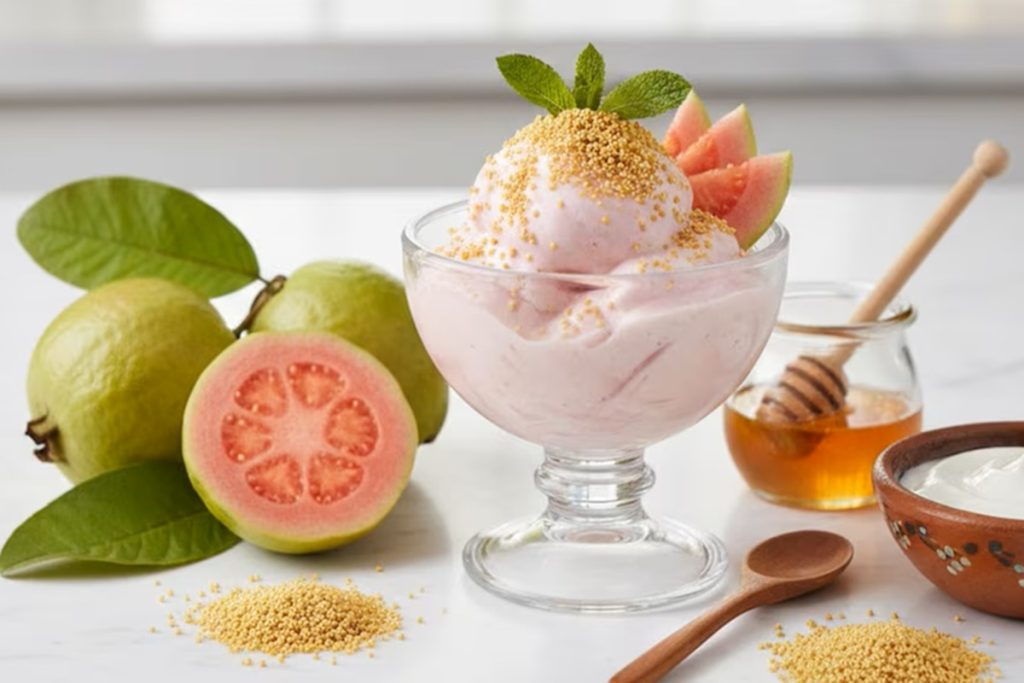 O sorvete caseiro de goiaba e iogurte com sementes de amaranto é uma receita fácil, fresca e diferente, combinando a acidez e a doçura natural da goiaba com a cremosidade do iogurte e o toque crocante e nutritivo do amaranto.